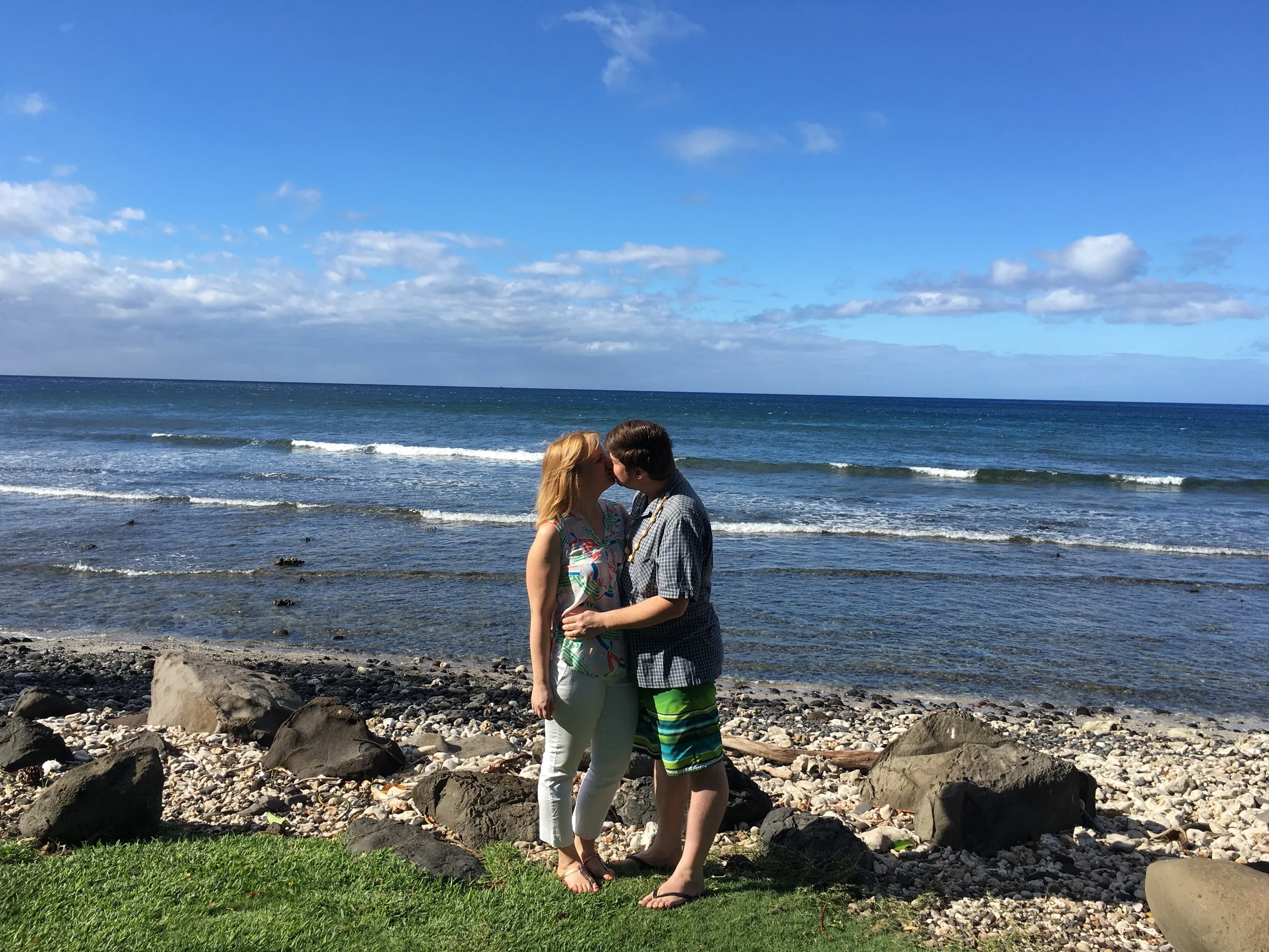 Melinda and Jeff share a warm embrace on the shore in Maui